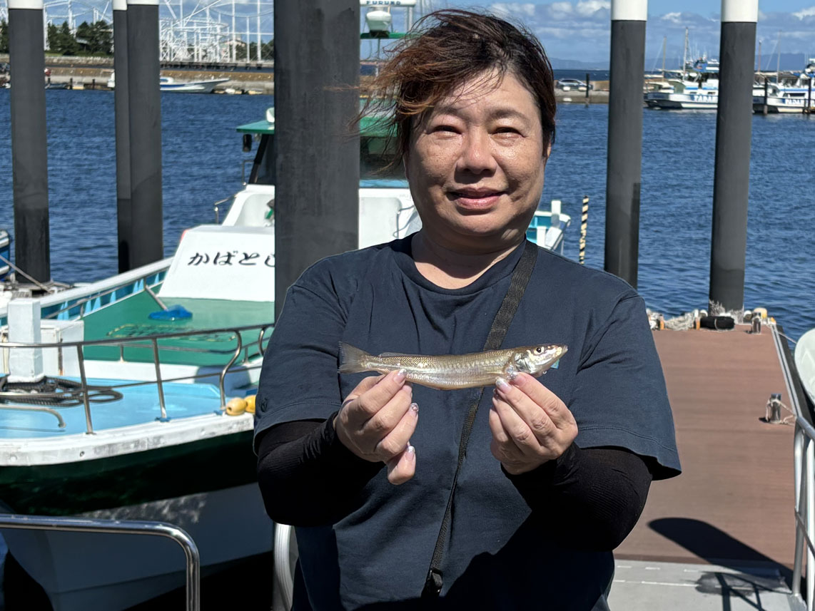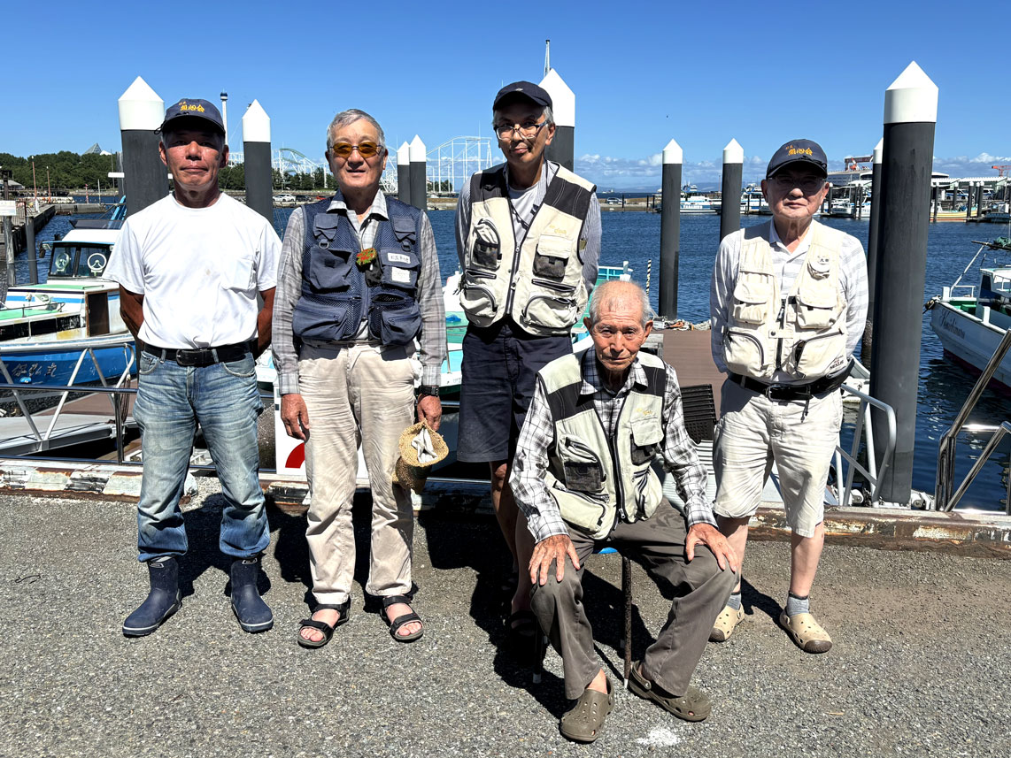 入賞の皆さん。左から高橋(毅)太田(育) 優勝の中野、高橋昇、太田(秀)さん 35℃超えの猛暑に耐えた皆さん 釣り時には忘れ、陸に上がって気付いた? 初めての大型賞です。21センチ。